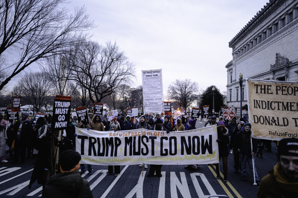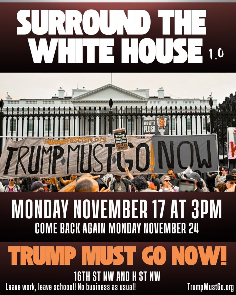 RefuseFascism.org works to unite all who can be united, from many different backgrounds and political perspectives, to join in mass, nonviolent protest and resistance in the streets and throughout society. We act with courage and conviction, refusing to stop until we create such a profound political crisis that Trump cannot impose his fascist program or maintain his hold on power. We pledge and demand: In the Name of Humanity, We Refuse to Accept a Fascist America! The Trump Fascist Regime Must Go Now!