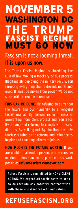 1. Spread the word: “Get to DC November 5.” The time has come for…THE FALL of the TRUMP FASCIST REGIME – Beginning November 5, Washington D.C. PRINT SOCIAL MEDIA 2. Commit to join and ask others to join you. COMMIT TO JOIN ASK OTHERS 3. Donate and raise funds. DONATE RAISE FUNDS