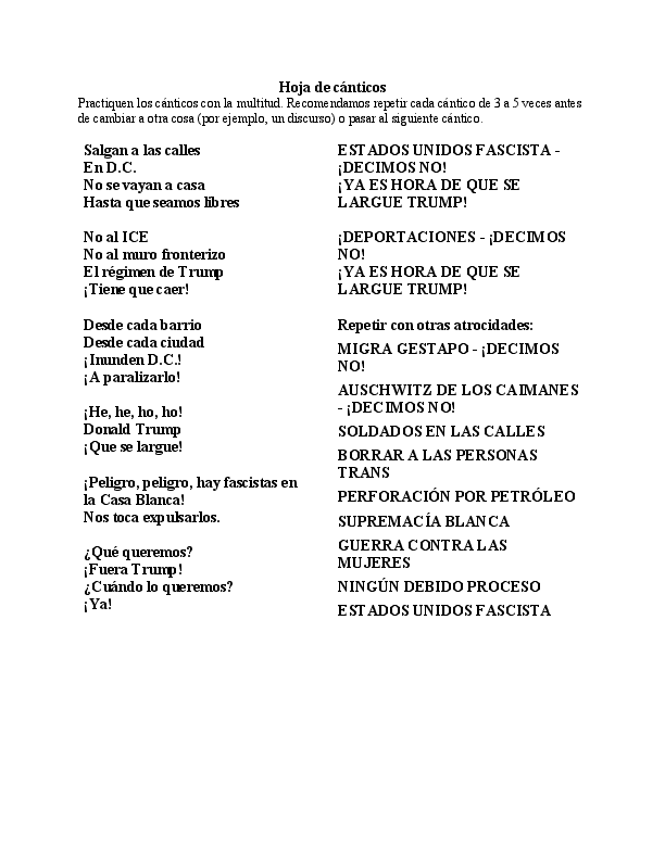 Print Chant Sheet MAIN CHANT TO USE THROUGHOUT MARCH: TRUMP MUST GO NOW! I II III What do we want?Trump Out!When do we want it?Now! From every blockFrom every townFlood DCShut It Down Danger, Dangerthere are fascists in the White House It’s up to usto drive them out. IV V VI No ICENo Border WallThe […]
