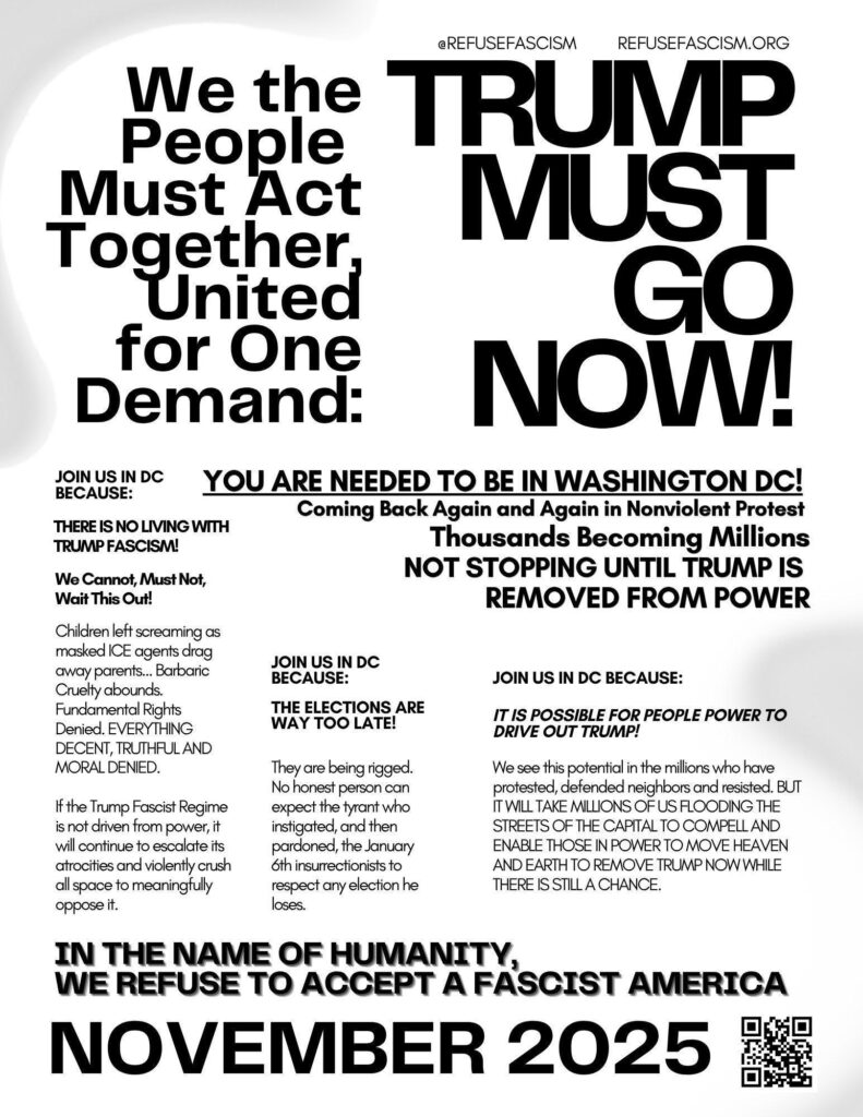 DOWNLOAD AND PRINT We the PeopleMust Act Together,United for One Demand: TRUMP MUST GO NOW! YOU ARE NEEDED TO BE IN WASHINGTON DC! Coming Back Again and Again in Nonviolent Protest with Thousands Becoming Millions NOVEMBER 2025 NOT STOPPING UNTIL TRUMP IS REMOVED FROM POWER * JOIN US IN DC BECAUSE: THERE IS NO LIVING […]