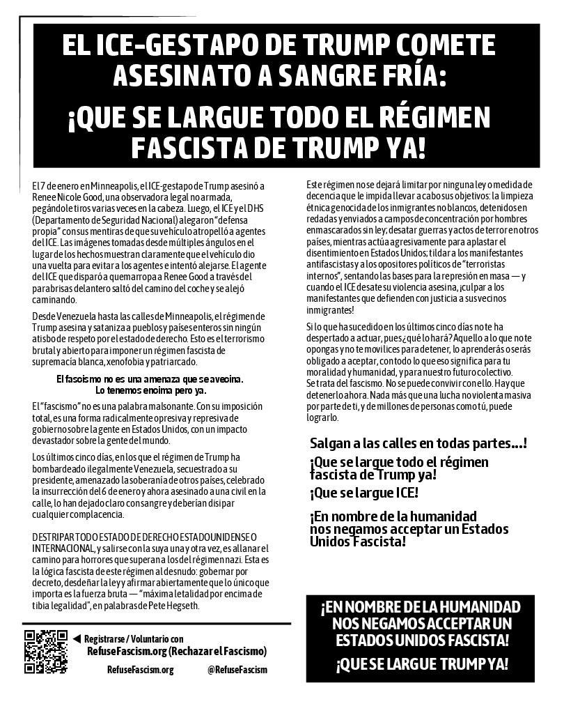 On January 7 in Minneapolis, Trump’s ICE Gestapo killed Renee Nicole Good, an unarmed legal observer, by shooting her in the head multiple times. Then ICE and DHS claimed “self-defense” with their lies that her vehicle ran over ICE agents. Footage from multiple angles at the scene clearly show the vehicle going around agents and […]