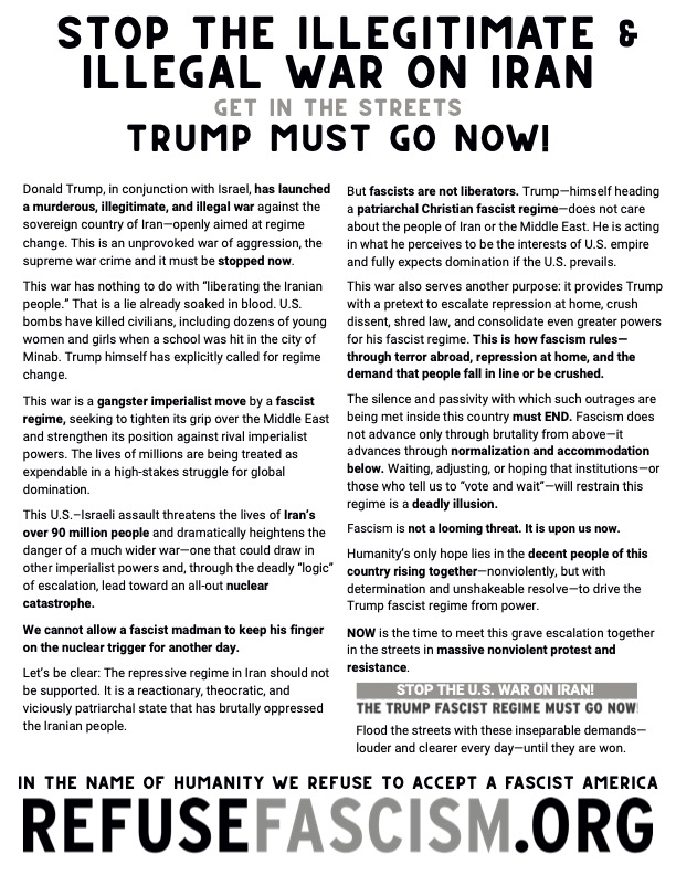 Donald Trump, in conjunction with Israel, has launched a murderous, illegitimate, and illegal war against the sovereign country of Iran—openly aimed at regime change. This is an unprovoked war of aggression, the supreme war crime and it must be stopped now.