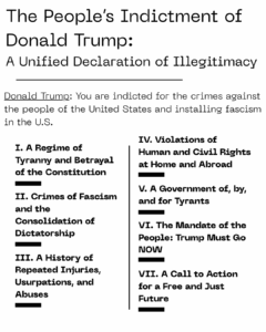 Your gift puts the People’s Indictment of Donald Trump—A Unified Declaration of Illegitimacy—across cities and campuses nationwide, turning truth into a visible force that organizes people to nonviolently drive the Trump fascist regime from power.