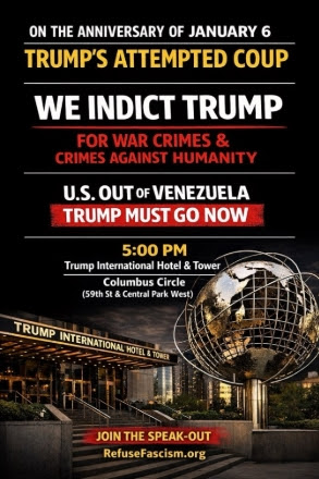 Five years after Trump’s attempted coup to overturn the results of the 2020 election, Refuse Fascism organizers say, “Enough is enough. The Trump Fascist Regime Must Go now!” In New York and Los Angeles, rallies will be held to read The People’s Indictment of Donald Trump: A Unified Declaration of Illegitimacy.
