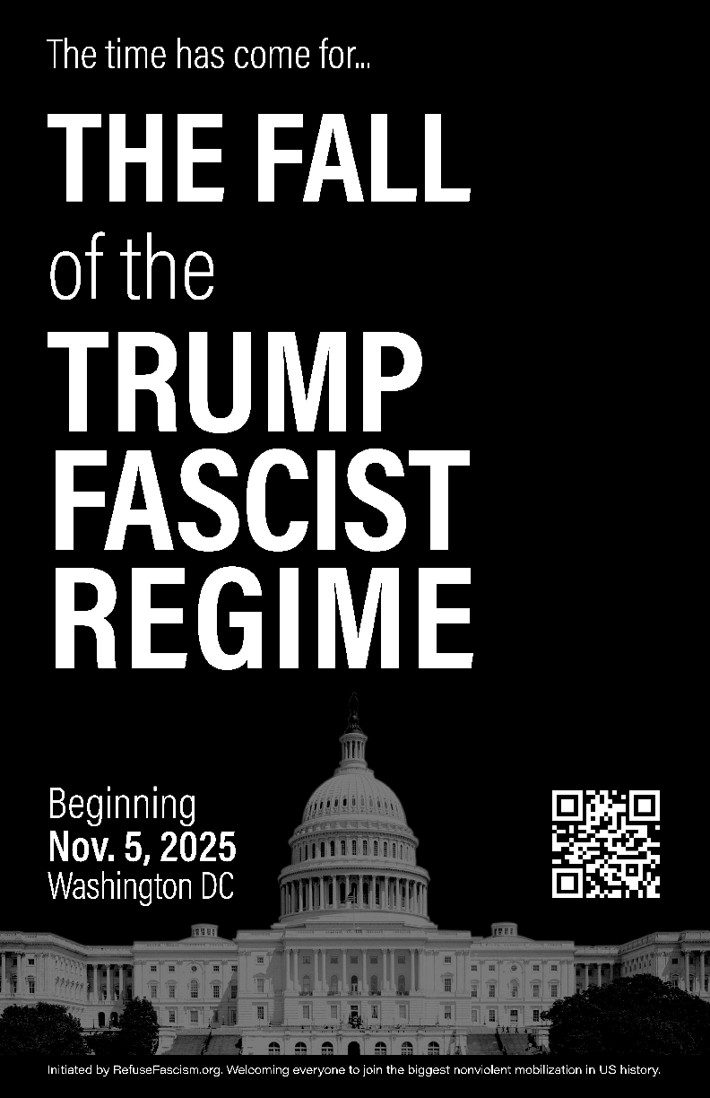20 October 2025 * for immediate releaseRefuseFascism.org917 407 1286@[email protected] available Watch Sunsara Taylor’s presentation at Refuse Fascism’s October 15th forum at Advent Lutheran Church in New York City. Sunsara Taylor1 and other spokespeople for Refuse Fascism’s Call for November 5 (see below) are available for interviews. _____________________ Refuse Fascism’s Call for November 5: The time has come for…THE FALL … Continue reading The time has come for…THE FALL of the TRUMP FASCIST REGIME — Beginning November 5, 2025 — Washington DCRefuse Fascism: All out for No Kings Day — Next is November 5