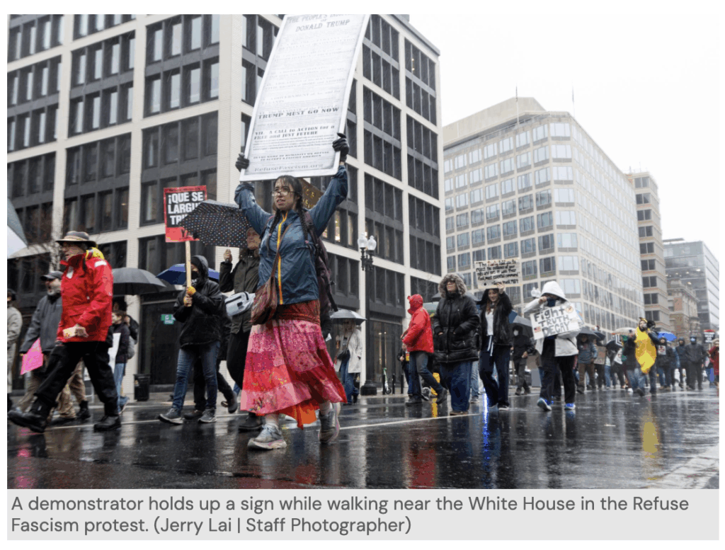 The protest, organized by Refuse Fascism as part of the nationwide “ICE Out for Good Weekend of Action,” began at 1 p.m. on Pennsylvania Avenue in front of the White House before demonstrators marched along Constitution Avenue to the south side of the complex. Speakers and chanting protesters called for the abolition of ICE and the removal of Trump from office, with demonstrators denouncing the agency as the “new Gestapo” and the administration as a “fascist regime” in the wake of the fatal shooting of Good by an ICE officer during the Trump administration’s latest immigration enforcement operation.