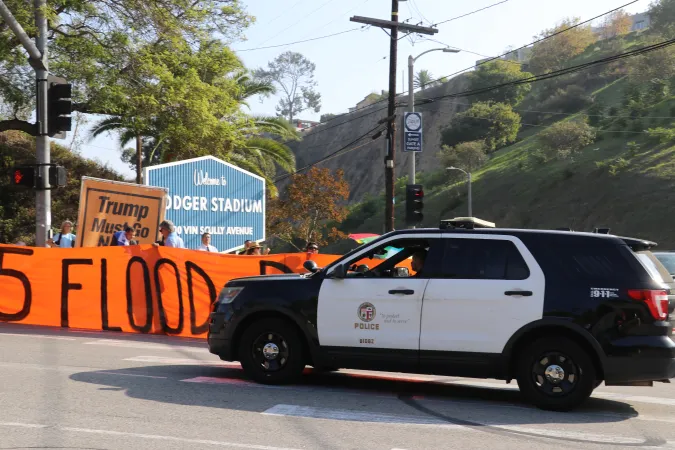 BG he vivido toda la vida en Los Ángeles, en la zona de Garvanza, y se unió a la protesta que amenazaron con disolver varios agentes del LAPD, llamados por personas de seguridad de los Dodgers, ya que habían colocado sus pancartas de “Alto al Fascismo. Trump debe irse ahora”, en los jardines del estadio del equipo.